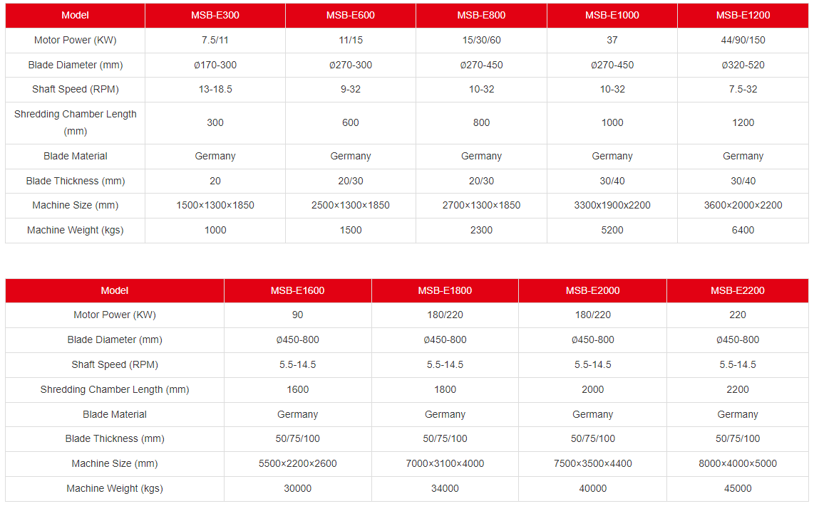 MSB-E Series Two Shafts Shredders are small to large size reduction machines suitable for processing a wide range of materials to a smaller size. The products can often be sold as is, or be sent for further processing through additional equipment. Throughout typically range between 300kg/hr – 20,000kg/hr+ depending on the model, material type and application. MSB-E Series Two Shafts Shredders are widely used in the volumetric reduction of various waste products, including but not restricted to the following. Light Scrap Metals,Bulky Waste,Wood Waste,Plastic Waste,Cardboard waste,Textiles Waste,Domestic Rubbish & Electronic Waste. The Output material discharged by the shredder could be an end product or the primary feed for the next process.