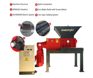 Four shafts shredders, or name it quad shredders, are perfectly suitable for scrap size reduction applications such as e-waste, rubber tire recycling, RDF production, and contaminated materials where uniformed medium particle size is desired. The four shaft shredders are very robust and built to sustain tough operating conditions without problem. ENERPAT four shafts shredders are available in different sizes and works perfectly in combination with other recycling machines. Each of the discs is made of alloy steel or furnished with a tool steel head. The discs can be replaced quickly thanks to the special shaft and blade design. The tool steel head is exchangeable quickly and without effort, which results in a significant reduction of tool changing times. The specific shape of the discs guarantees to crush material with little expenditure of energy, it makes the scrap-shredder to be durable.