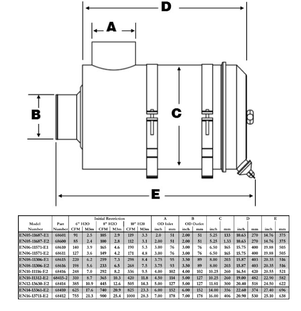 Metal Air Cleaner Canisters Available in Wide Range of Sizes. Air Flow to 1100 CFM. Great Fit for Medium to Extreme Environments. Two Mounting Brackets as Standard and Included in Price. Vacuum Ports in the Outlet. Available with Dual Elements (E2 style) or Primary Only (E1).