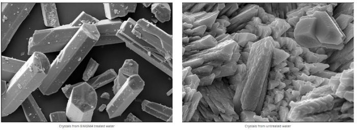 Using modern microprocessors and signal processing techniques, the ENiGMA produces a complex, frequency modulated waveform.  When these frequencies are applied, an oscillating electric field is induced into the water resulting in agitation of water molecules sufficient to trigger the release of carbon dioxide (CO2) resulting in the premature precipitation of calcium bicarbonate.  Because precipitation occurs in the bulk of the water, the crystals seed onto other naturally occurring ions in the water, such as zinc.  Their size and shape bear no physical resemblance to those formed in untreated water and they remain in suspension until discharged to drain.