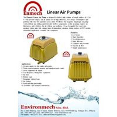 The Enmech linear air pump is designed to deliver high volume of steady airflow at 0.1 to 0.5 bar pressure ranges, our Enmech linear air pumps are of high efficiency, low energy consumption and perform with very low operation noise under 50 dB(A). The magnetic diaphragm air pump works without any sliding parts but only oil-free components, so the air pump requires no lubrication and it delivers the air without any pollution. It can be applied for wastewater aeration, septic tank, fish, shrimp farm of aquaculture aeration, dental suction or ENT suction of medical application, scientific lab. equipment.