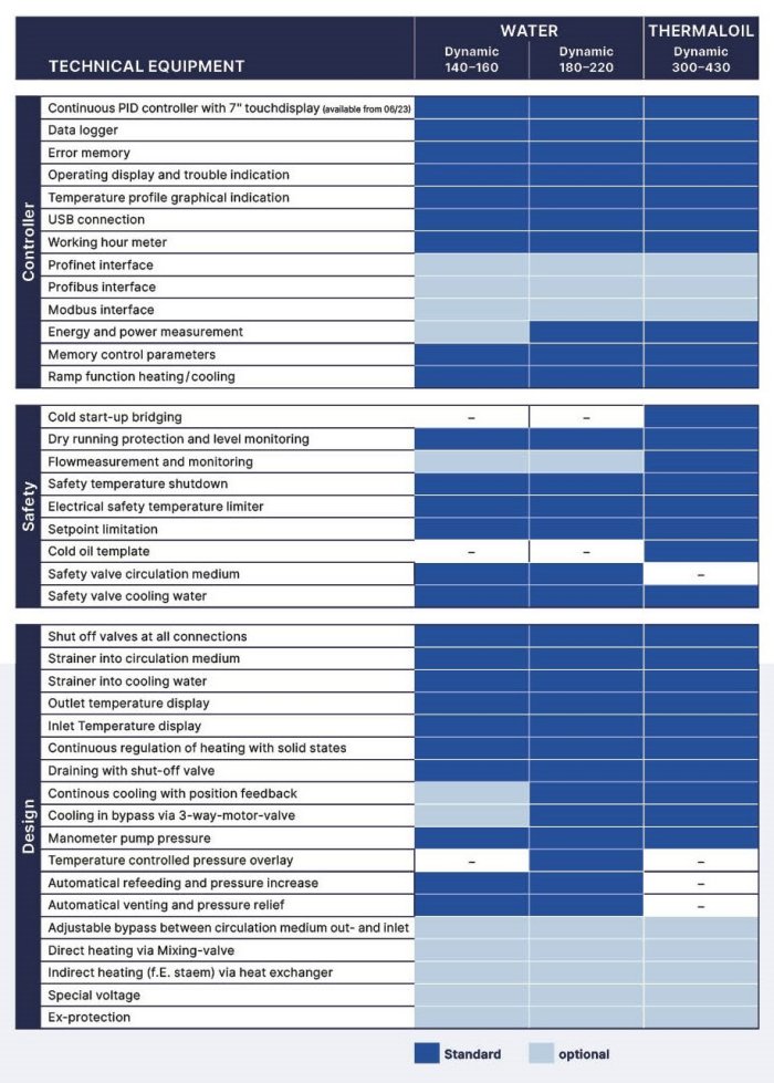 Pressurised-water units are generally used for temperatures up to 220 °C. Oil units are used for higher temperatures (up to 430 °C). The modular series are produced with power ratings of 6–350 kW (electrically heated) and throughputs of 3–350 m³/h. However, more powerful systems are also possible on request.