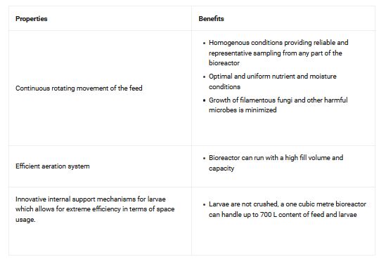 As insect larvae, microbes and digestive enzymes form a self-sustaining environment, the cultivation process is very stable. Very soon the microbial population in the bioreactor becomes similar to the microbiota of the larvae digestive tract. Additionally, larvae excrete enzymes and bacteria-killing substances such as chitin and antimicrobial peptides into the feed.