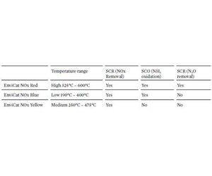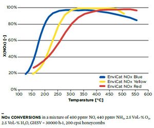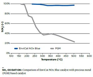 EnviCat NOx Blue and EnviCat NOx Red catalysts are be operated at higher temperatures than conventional precious metal (PGM) based catalysts, they form mainly N2 with a selectivity typically above 90 %.