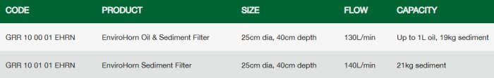 The Oil and Sediment EnviroHorn will hold 19kg of sediment and will soak up a light oil sheen. However, the EnviroHorn should be replaced once this has occurred. If you regularly have oil sheen on your site run-off, a drain filter is not sufficient protection. You should investigate the causes and deal with them at source using other Green Rhino products.