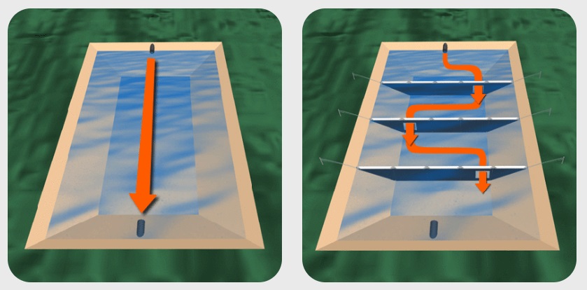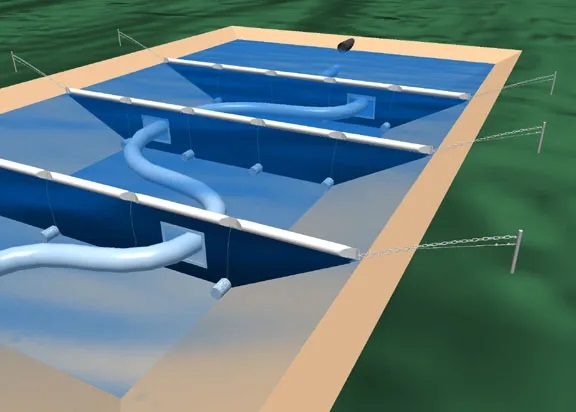 Dramatically improve wastewater treatment lagoon efficiency with the Director I Floating Baffle System. Facultative Lagoons: Flow diversion curtains increase hydraulic retention time (HTR) and can increase the effective treatment area of a lagoon from less than 20% to over 95%. Floating baffles create hydraulic flow patterns that guide wastewater through a serpentine route from the inlet to the outlet, improving aeration and allowing contaminants and solids to settle. The extended treatment time significantly reduces Biological Oxygen Demand (BOD) and Total Suspended Solids (TSS).