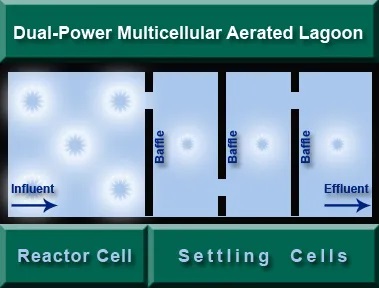 Floating baffle curtains separate reactor cells from settling cells to create a dual-power, multicellular (DPMC) aerated lagoon system, allowing aerators to operate more efficiently to dramatically reduce energy costs. The DPMC system consists of four cells separated by baffles. In the first reactor cell, intense aeration generates enough oxygen to convert the influent CBOD to carbon dioxide and biomass while maintaining solids in suspension. The following three settling cells provide sedimentation, solids stabilization, and sludge storage. The settling cells use less aeration to allow solids to settle while supporting a thin aerobic layer at the top of the solids deposit to inhibit algal growth. A properly designed dual-power, multicellular (DPMC) aerated lagoon system using floating baffle curtains uses 50% less power than a comparable Activated Sludge system.