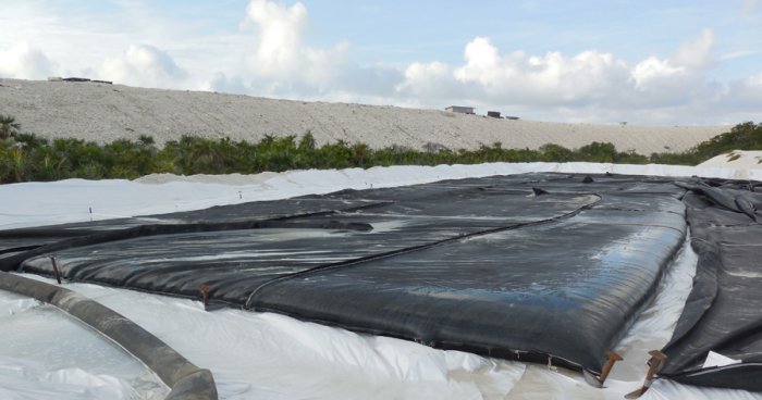 After installing the membrane, a non-woven geotextile may be installed over the entire surface to protect the membrane against heavy machinery traffic.