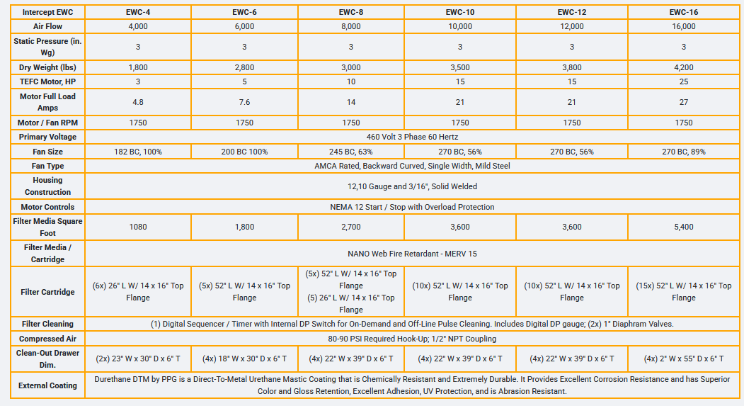 Each Intercept EWC Series Environmental Work Cell is a self-contained, modular cartridge dust collection system. Sizes range from 4,000 – 16,000 CFM. Designed to accommodate booth enclosures of various sizes, EWCs are used in singular or multiple-unit configurations to solve dust containment challenges for large-area applications where source capture is not practical. The work area is continuously cleaned by MERV-15 cartridge filters with filtration capabilities of 99% efficiency down to 0.5 micron. Cleaned air is exhausted back into the plant environment. Booth enclosures are custom designed to meet process requirements. The EWC features internal reverse pulse filter cleaning assemblies, with nested diaphragm valves and compressed air manifolds. The light-weight, torturous-path aluminum louvered front inlet panels are easily removed for full access to the filter chamber. Dust is captured in the slide-out drawers below.