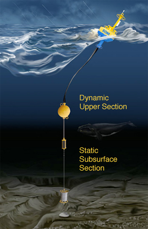 EOM has developed the platform for a unique Whale Alerting System, designed to minimise collisions between whales and shipping in areas where shipping lanes converge with whale migration and calving grounds. The system, which has been successfully deployed off the coast of the USA, utilises EOM`s Auto-Detection Moorings. The EOM mooring system solves the problem of high flow-noise-to-signal ratios in passive acoustic applications. This is achieved using a robust mooring system (patent pending) that isolates the hydrophone from surface buoy motions. This system breaks the mooring into two sections: a dynamic upper section consisting of the surface buoy and an electromechanical (E/M) stretch mooring hose, and a static subsurface section that provides a quiet mounting location for the hydrophone.