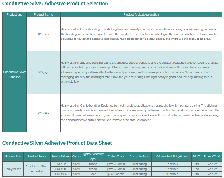 DeepMaterial Conductive silver adhesive is a one-component modified epoxy/silicone adhesive developed for the integrated circuit packaging and LED new light sources, flexible circuit board (FPC) industries. After curing, the product has high electric conductivity, heat conduction, high temperature resistance and other high reliable perfor- mance. The product is suitable for high-speed dispensing, dispensing good type protection, no deformation, no collapse, no diffusion; The cured material is resistant to moisture, heat and high temperature. Can be used for crystal packaging, chip packaging, LED solid crystal bonding, low temperature welding, FPC shielding and other purposes.