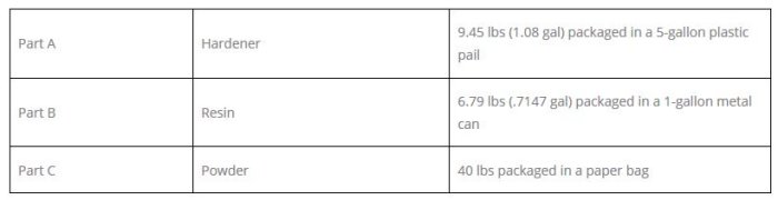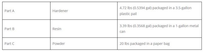 Remix Hardener (Part A) by shaking the container. Remix contents of the Liquid component (Part B) for a minimum of 2 minutes with a slow speed paddle or "Jiffy" mixer. Combine contents of Hardener to Liquid and mix for a minimum of 2-3 minutes. Add Powder (Part C) and continue mixing for 2-3 minutes or until thoroughly blended. Mix only complete batches.