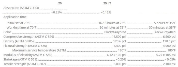 25 and 25 LT are used to construct floors, sumps, trenches, tanks and bleach towers in chemical processing, food & beverage plants; dairies; laboratories; textile, steel and pulp & paper mills. These Sauereisen mortar/setting beds have excellent resistance to strong oxidizing environments, sulfuric acid and some solvents up to 180°F.