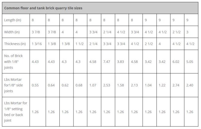The above quantity requirements are based upon physical dimensions of chemical resistant masonry units and actual weight of mortar as determined by ASTM C-905. Actual usage rate will vary dependent upon scope of installation, experience of workmen, field conditions and other contingencies. Personnel using the above chart