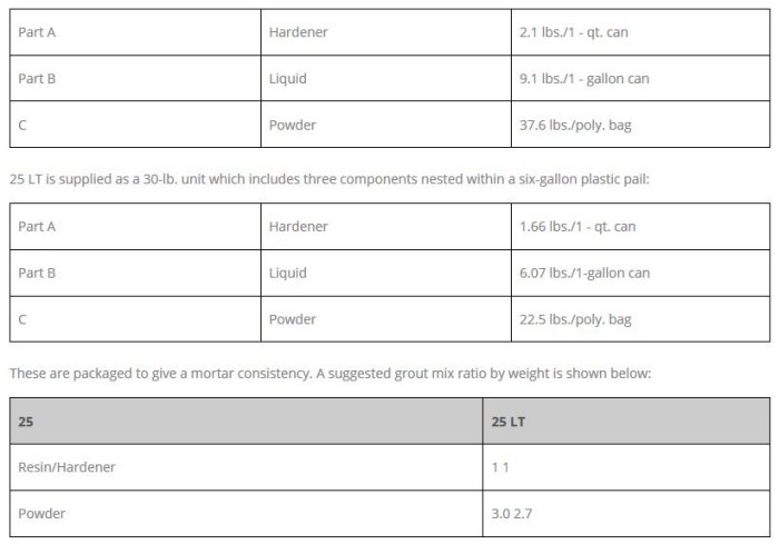 25 is supplied as a 48.8-lb. unit which includes three components nested within a six-gallon plastic pail: