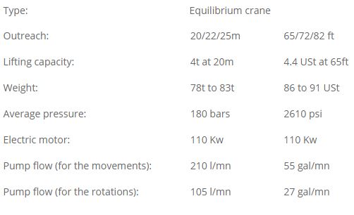 Capacity: 80t.m. Power: 110kW Electrical. Reach: 20/22/25m – 66/72/82ft. Support: Fixed/AS*/Rails/Crawlers. Weight: 78t to 83t. *Free standing.