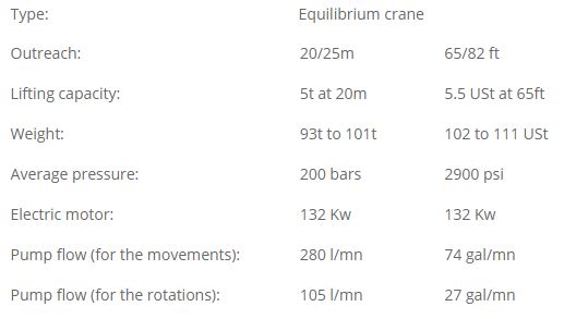 Capacity: 100t.m. Power: 132kW Electrical. Reach: 20/25m – 66/82ft. Support: Fixed/AS*/Rails/Crawlers. Weight: 93t to 101t. *Free standing.