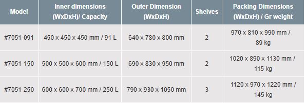 - Supplied with stainless steel wire mesh shelves. Shelf height adjustable in 25mm steps.