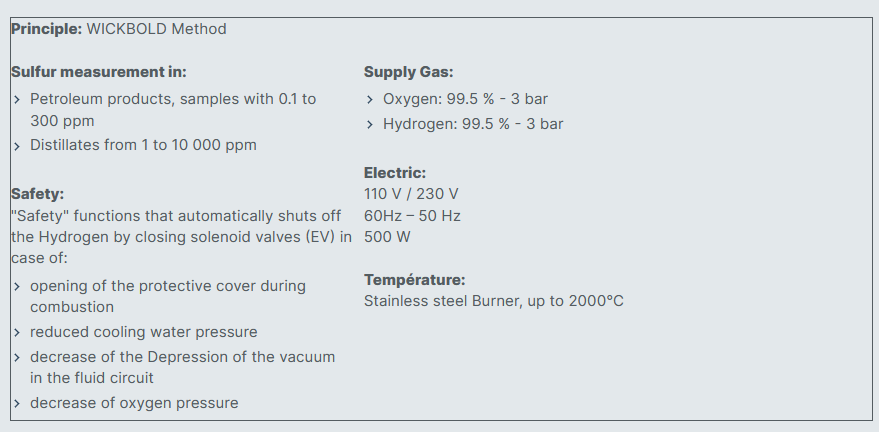 Our apparatus having an Oxy-hydrogen burner is used to determine total sulfur by the Wickbold method. This test method covers the determination of total sulfides in liquefied petroleum gases containing more than 1 μg / g. Samples must contain less than 100 μg / g of halogen.