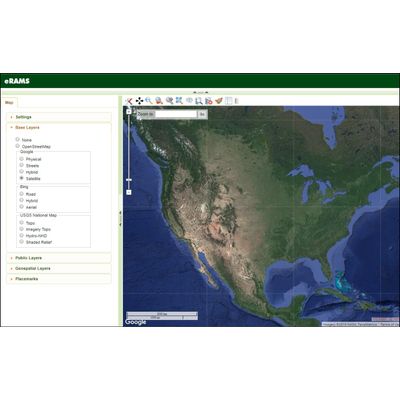 Base Layers are user selected representations of the land surface that can be viewed at multiple scales. Base layers form the foundation of a map and can be selected or deselected by clicking on the radio button next to each layer. Base layers cannot be user modified and only one basemap can be selected at any time. Below you will find a description for each type of Base Layer available using the eRAMS GIS/Analysis interface.