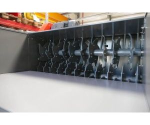 The EKZ cardboard shredder consists of two shafts with independent drives, a slow-running infeed shaft and a faster ripper shaft, which shreds the cardboard boxes into the desired size. Segments of wear-resistant special steel are used for this purpose, which are arranged on the shredder rotor in such a way that they point alternately obliquely outward and inward. In this way, the rotation of the shaft produces a wobbling motion that ensures the desired shredding effect. The rotors, which are very large at 520 mm in diameter, also process large-format cardboard without any problems. In addition, the infeed and shredder rotors are equipped with a special scraper system that prevents the shaft from wrapping and ensures a stable material feed.