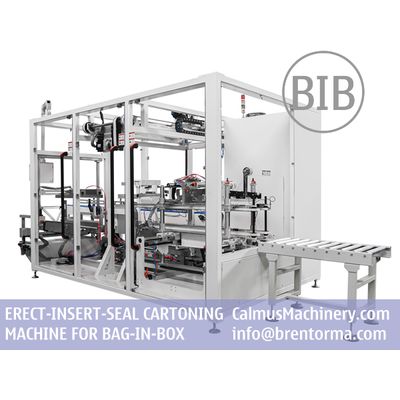 This is a fully-automated erect-insert-seal monoblock cartoning machine for packaging bag-in-box. It works by erecting flat-fold cartons and sealing their bases to form boxes, inserting filled bags in boxes by one each from conveyor with the help of hopper, sealing the carton box tops with tape or hot-melt glue, fully-automatically. The cartoning machine can be customized to package 3-25 litre bag-in-box according to customers' requirements. This monoblock packaging machine can be installed easily by customers themselves.