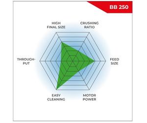 The Jaw Crusher BB 250 is a robust and powerful forced-feed crusher. The feed material passes through the no-rebound hopper and enters the crushing chamber.