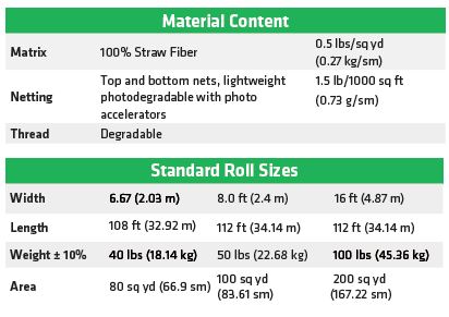 The ultra short-term double net erosion control blanket shall be a machine-produced mat of 100% agricultural straw with a functional longevity of up to 2 months. (NOTE: functional longevity may vary depending upon climatic conditions, soil, geographical location, and elevation). The blanket shall be of consistent thickness with the straw evenly distributed over the entire area of the mat. The blanket shall be covered on the top and bottom sides with a polypropylene netting having an approximate 0.50 x 0.50 (1.27 x 1.27 cm) mesh with photodegradable accelerators to provide breakdown of the netting within approximately 60 days, depending upon geographical location and elevation.