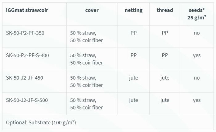 There are different types of the classic erosion control blanket made of straw and coir in the iGGmat straw coir product series. They all have a fiber layer of straw and coir and are stitched either on one or both sides with a backing made of PP-netting or jute fabric, as well as a PP- or jute-fiber. All iGGmat strawcoir products can also be supplied as seeded blankets. In this case a carrying paper with seeds is stitched to the fiber cover. iGGmat strawcoir is used on areas at risk of erosion with up to 20° slope (1:2.7) for temporary erosion control. The lifetime of the iGGmat strawcoir is up to 24 months. It depends on the conditions of the location, the soil, water and climatic conditions as well as the risk of erosion on-site. iGGmat strawcoir products are up to 100 % biodegradable.