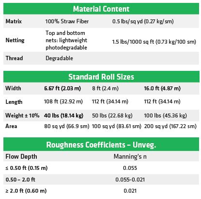 The short-term double net erosion control blanket shall be a machineproduced mat of 100% agricultural straw with a functional longevity of up to 12 months. (NOTE: functional longevity may vary depending upon climatic conditions, soil, geographical location, and elevation). The blanket shall be of consistent thickness with the straw evenly distributed over the entire area of the mat. The blanket shall be covered on the top and bottom sides with a lightweight photodegradable polypropylene netting having an approximate 0.50 x 0.50 in. (1.27 x 1.27 cm) mesh. The blanket shall be sewn together on 1.50 inch (3.81 cm) centers with degradable thread. The blanket shall be manufactured with a colored thread stitched along both outer edges (approximately 2-5 inches [5-12.5 cm] from the edge) as an overlap guide for adjacent mats.