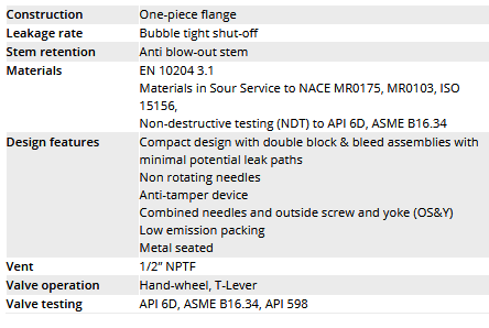 Needle valves have no ball and are mainly used for flow metering and damping pressure fluctuations as instrument valves. These valves are designed to replace conventional multi-valve installations into a single manifold reducing leaking points and allowing easy and quick installation in vertical or either in horizontal position with considerable cost savings. One piece compact solutions designed to replace conventional multi-valve installations in measuring systems with reduced number of leak paths.