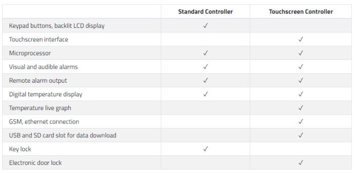 - audible and visual alarms for high/low temperature, door open, and power failure
