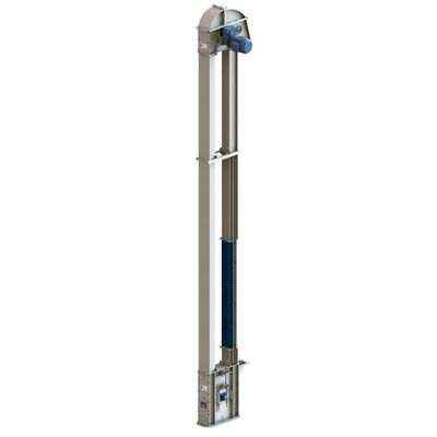 Direct drive gearmotor IP55. Non-return. Painted steel. Strap : anti-fire, anti-grease, anti-static (ISO 340 / ISO 284). Bucket Elevator for handling and elevation of bulk products such as grains, pellets, powders…