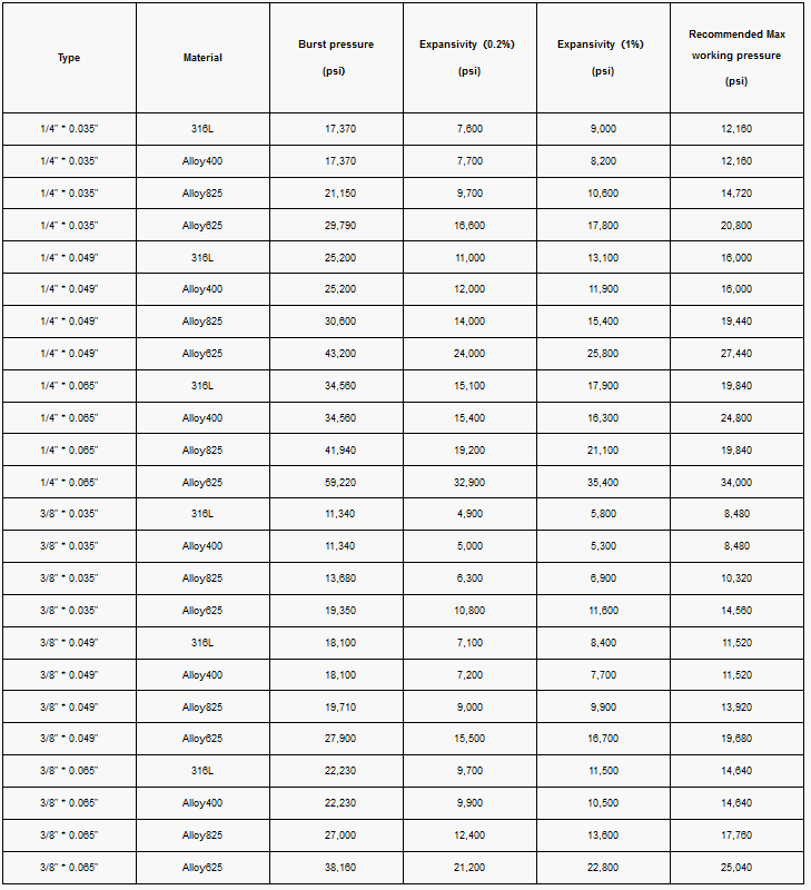 Material:316L, 316Ti, Alloy 400, Alloy 825, Alloy 625, Duplex 2205, Duplex 2507. Capillary OD:1/8", 1/4", 1/2", 3/8", 3/4", 5/8". Capillary wall thickness:0.028", 0.035", 0.049", 0.065", 0.083".