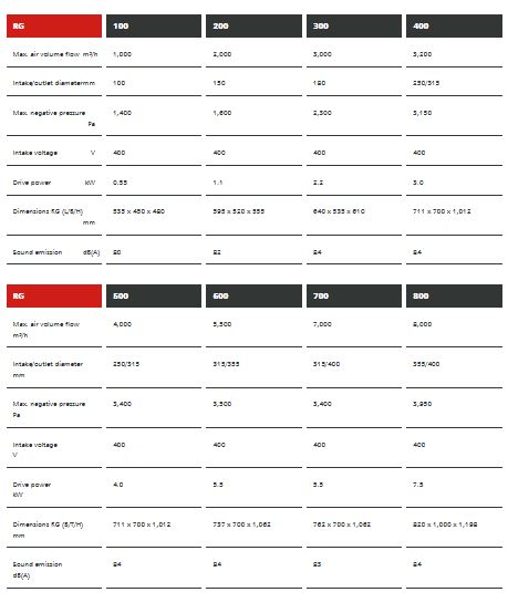 Medium-pressure fans for exhaust air operation without filtration. Dust, fumes or vapours need not always be filtered. RG extraction fans designed for extraction operation work together with capture elements (e.g. an extraction arm) to extract dust- and fumous air and directed to the required area unfiltered via a pipe system. The RG series devices are suitable for granulates or as a feed blower for ventilation of rooms, tanks and shafts.