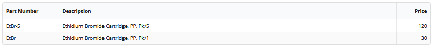 Thomson Instruments can now offer a special and specific product to safely capture excess EtBr from developed gels so the waste can be handled safely and easily. Gravity fed, our solid state cartridge processes 3-5 liters with EtBr concentrations of 0.5µg/ml and reduces the effluent concentration to a minimum detectable limit of 0.025µg/ml.