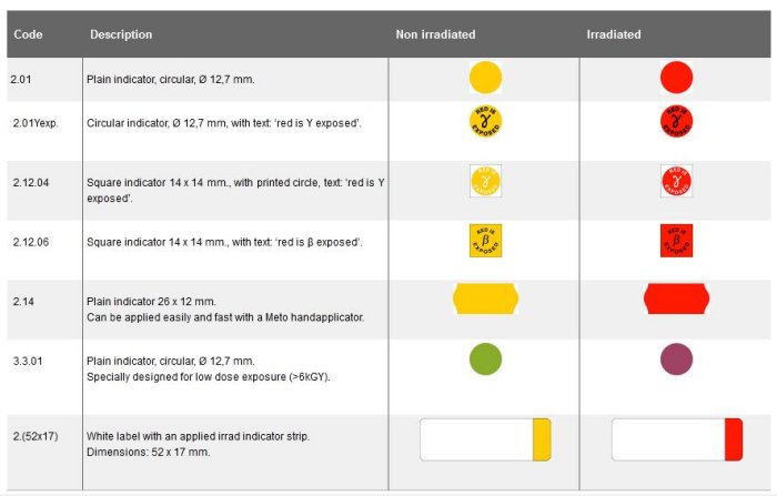 Etigam Irrad indicators are stick on labels which are designed to demonstrate that the item has been exposed to sufficient gamma, X-ray or beta irradiation. They distinguish the difference between processed and non-processed items by a colour change of the indicator. These indicators are to be used on individual items to be sterilized. The standard indicators are manufactured in different shapes (round, square or Meto shape) and some also feature text. These indicators can be delivered from stock.