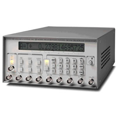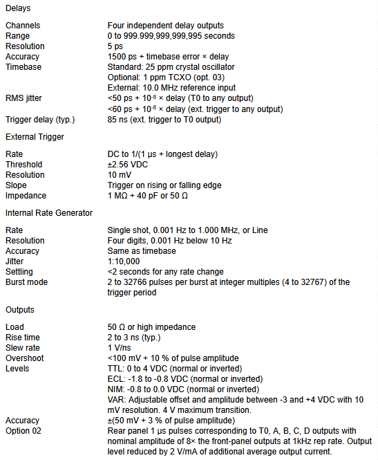 Four independent delay channels. Two fully-defined pulse channels. 5 ps delay resolution. 50 ps rms jitter. Adjustable amplitude and offset. Delays up to 1000 seconds. Standard GPIB interface. Optional ±32 V output.