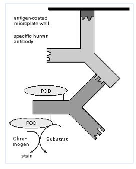 - In a third step, the bound antibodies are made visible using a chromogen/substrate solution which is capable of promoting a color reaction. The intensity of the color produced is proportional to the concentration of antibodies in the serum sample.