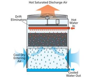 Warm water from the heat source is pumped to the water distribution system at the top of the tower. The water is distributed over the wet deck fill by means of large orifice EvapJet™ nozzles. Simultaneously, air is drawn in through the air inlet louvers at the base of the tower and travels upward through the wet deck fill opposite the water flow. A small portion of the water is evaporated which removes the heat from the remaining water. The warm moist air is drawn to the top of the cooling tower by the fan and discharged to the atmosphere. The cooled water drains to the basin at the bottom of the tower and is returned to the heat source. The vertical air discharge of the AT design and the distance between the discharge air and fresh air intakes reduces the chance of air recirculation, since the warm humid air is directed up and away from the unit.