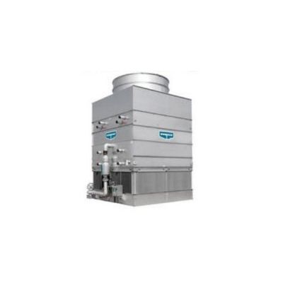 The refrigerant gas is discharged from the compressor into the inlet of the ARID fin Pak dry coil, which is positioned in the dry air stream above the unit’s drift eliminators and below the fan section; the axial fan draws into the unit, through the bottom inlet louvers. As the air passes over the coil, a portion of the load is dissipated to the atmosphere through the tube walls and fins through sensible heat transfer.