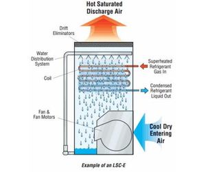 The refrigerant gas discharges from the compressor into the inlet connection of the condenser. Heat from the refrigerant dissipates through the coil tubes to the water cascading downward over the tubes. Simultaneously, air is forced in through the two-stage vane axial fans at the base of the condenser and travels upward through the coils, opposite the water flow. A small portion of the water evaporates, removing heat from the system; the saturated hot air is discharged to the atmosphere. Cooler water drains to the basin at the bottom of the condenser where it is recirculated by the pump up through the water distribution system and back down over the coils. The vertical air discharge of the LRC design and the distance between the discharge air and the fan intake reduce the chance of air recirculation since the warm humid air is directed up and away from the unit.