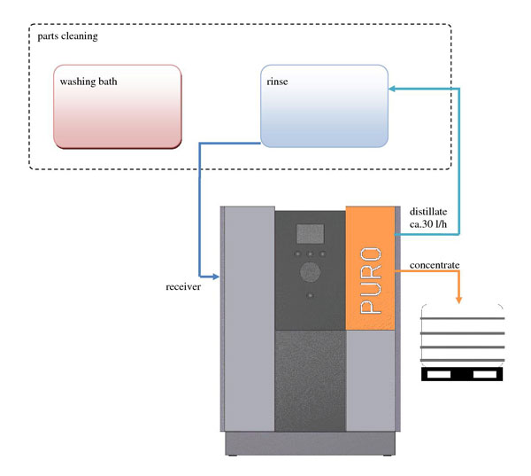 Innovation in the rinsing bath care: World novelty PURO. The industry doesn’t discuss very long about the purchase of parts washing systems. But it is a open secret, that they are operated with polluted waste water. The reason: The sole plant for the rinsing bath care mostly costs half as much as the parts washing system oneself. The consequence: If the rinsing bath of a industrial parts washing system isn’t cared for continuously, a constant quality of the washed products can’t be warranted.