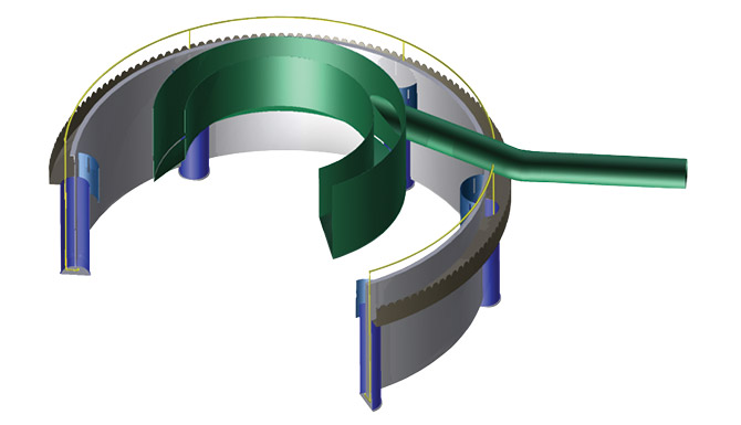 • The inner EvenFlo raceway separates the two steps of receiving the feed stream and distributing it into the feedwell. This buffers the feedwell performance from feed stream momentum, providing steady mixing in the outer feedwell regardless of the feed stream velocity. Conversely, other tangentially-fed feedwells cannot effectively manage the feed momentum, and they greatly lose efficiency at low or high velocities.