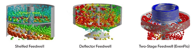 Conventional thickener feedwell designs have two main shortcomings: short circuiting, where the feed stream momentum carries the flow prematurely down and around the feedwell, past the shelf and deflector, and out of the feedwell; and inefficient flocculation, where only a small area around the inlet of the feed provides good mixing.