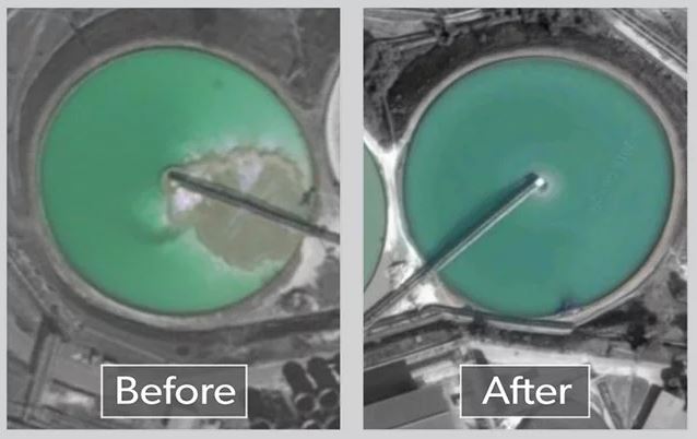 The benefits of retrofitting three 135-meter traction thickeners is shown below; the short-circuiting flow seen in the Before photo is corrected by retrofitting an EvenFlo Feedwell in the thickener in the After photo.