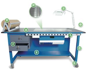 - Wheels allowing the bench to be moved throughout the building wherever processing needs to take place.
