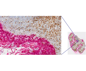 Tonsil CD3 (rm), ImmPRESS Reagent (HRP) Anti-Mouse IgG Immpact DAB (brown), AE1/AE3(m) ImmPRESS (AP) (HRP) Anti-Rabbit IgG Immpact Vector Red (red). Counterstained with Hematoxylin QS (blue). Image data courtesy of Vector Labs.