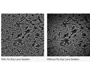The fluorescence illuminator’s fly-eye lens uniformly distributes light across the entire field of view for bright, evenly illuminated images.