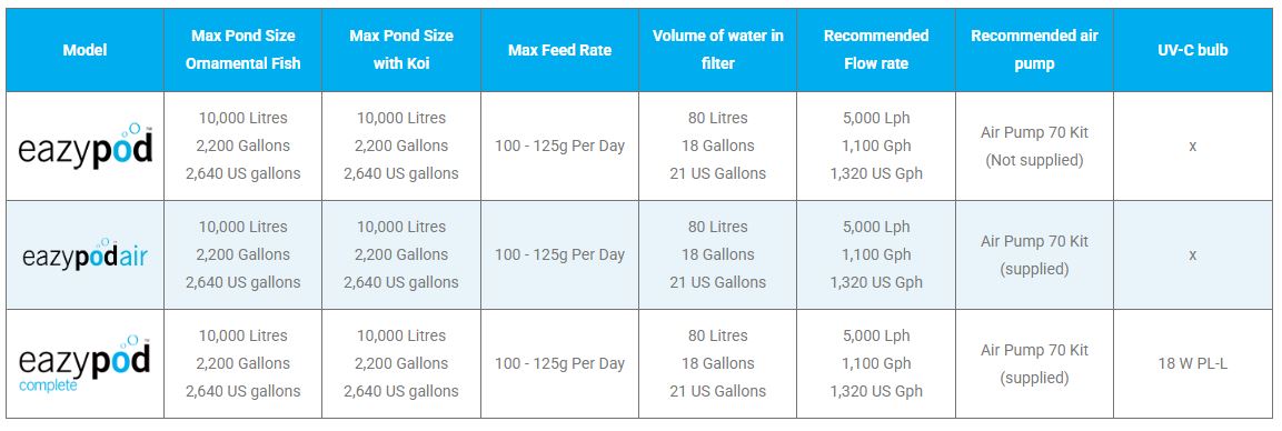 A compact member of the Nexus family, the EazyPod is a mechanical and biological filter system for ponds up to 10,000 litres. The EazyPod utilises 18 litres of static K1 Micro, which provides enhanced biological benefits, even when using the EazyPod solely as a mechanical waste filter. Also available as EazyPodAir models, which come supplied with AirPump70 Kit.